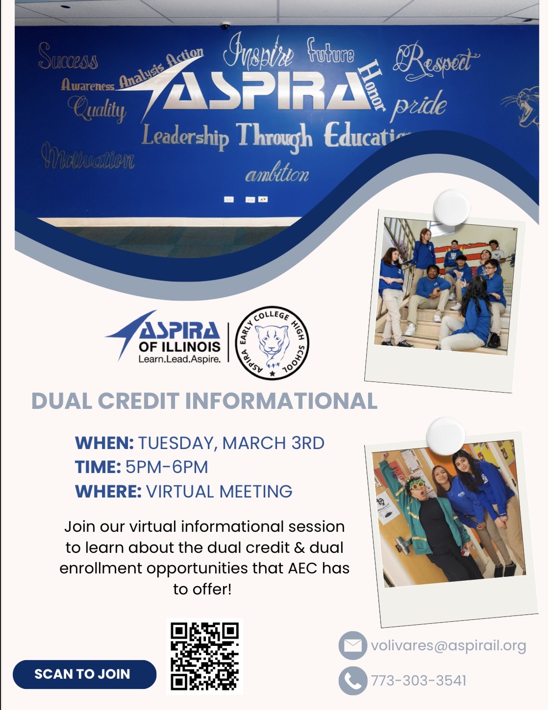 DUAL CREDIT INFORMATIONAL | INFORMATIVO SOBRE DOBLE CRÉDITO Attention prospective families, join us virtually on Tuesday, March 3rd 5pm-6pm for Aspira Early College’s dual credit…