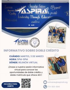 Attention prospective families, join us virtually on Tuesday, March 3rd 5pm-6pm for Aspira Early College’s dual credit informational. This is an opportunity for students and families to learn about AEC’s dual credit/enrollment courses. Learn how your high school scholar can earn college credit while earning their high school diploma!Atención, familias interesadas: únanse con nosotros virtualmente el martes 3 de marzo de 5pm-6pm para la sesión informativa sobre el programa de doble crédito de Aspira Early College. Esta es una oportunidad para que estudiantes y familias conozcan los cursos de doble crédito/doble matrícula de AEC. ¡Descubran cómo su hijo/a puede obtener créditos universitarios mientras obtiene su diploma de escuela secundaria!